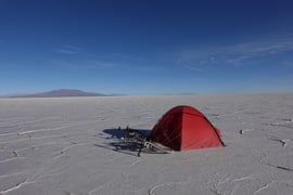 Morgen auf dem Salzsee Coiposa, wo wir das Zelt den Abend zuvor bei starkem Wind aufstellen mussten.