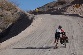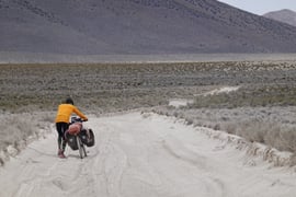 Ganz mühsam ist tiefer feiner Staub mit Steinen dazwischen, sodass wir die Fahrräder stossen müssen.