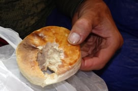 Ein Nagetier hat zwei grosse Löcher in eine der Velotaschen gebissen und ein grosses Loch in diesem Brötchen hinterlassen.