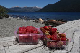 Wir sind hier im Beerenparadies. Nebst Him- und Erdbeeren trinken wir heute einen Liter Himbeersaft!