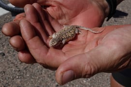 Diese kleine Eidechse haben wir heute fast überfahren. Zum Glück sieht man vom Velo aus selbst die kleinste Ameise auf der Strasse.