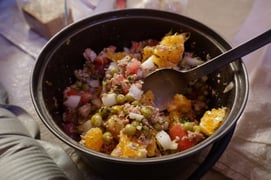 Da wir Morgen beim Grenzübertritt nach Chile verschiedene Esswaren nicht einführen dürfen, gibt es eine Pfanne mit Tomaten, Zwiebeln, Orangen, Thunfisch, Erbsen und Olivenöl.